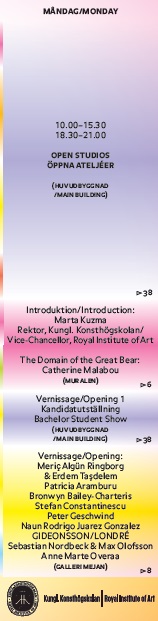January 26, 10:00-15:30/18:30-21:00. Kungl. Konsthögskolan Campus (studios in the main building, Cannon Workshop (house 117) and graphics house)